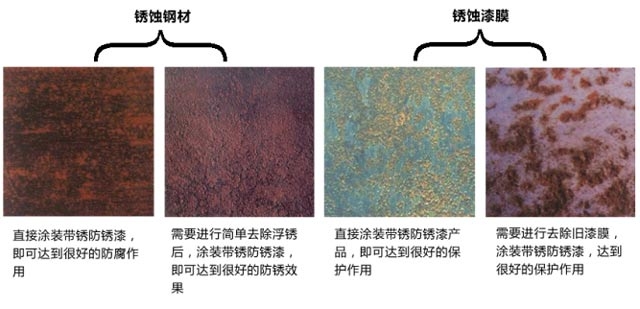 一般的銹蝕鋼材需要噴砂或打磨處理后才能進(jìn)行油漆涂裝,噴砂打磨耗時大,成本高,采用帶銹防銹漆即可解決以上問題。